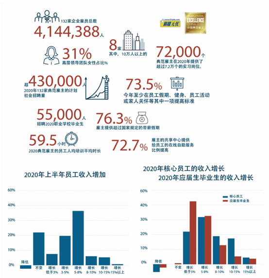 2020年上榜的132家典范雇主拥有雇员414万人,60家雇主拥有中国雇员过万人,8家雇主的员工超过10万人,91家为海外或国内上市公司。截至2020年6月30日,132家雇主平均现有员工量比去年同期增长3.8%,45家雇主的员工本科学历占比超过70%,星巴克中国、强生中国、浪潮集团等17家雇主的90后员工比例已经过半。