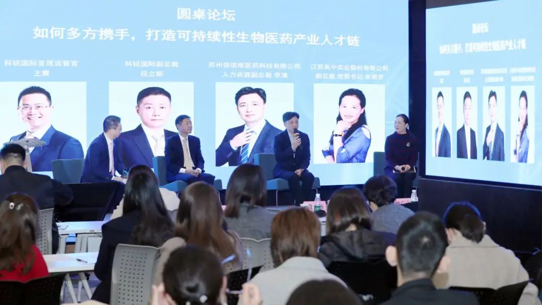 在圆桌论坛环节,科锐国际首席运营官王震作为圆桌主持人,同科锐国际副总裁段立新、苏州信诺维医药科技有限公司人力资源副总裁李清、江苏吴中实业股份有限公司副总裁、党委书记朱菊芳共同就“如何打造可持续生物医药产业人才链?”,“怎样把HR工作做得更好?”,“专精型人才、复合型人才,哪个是未来所需?”等话题展开深度探讨,几位大咖嘉宾分别围绕自身实践和洞察分享了真知灼见。